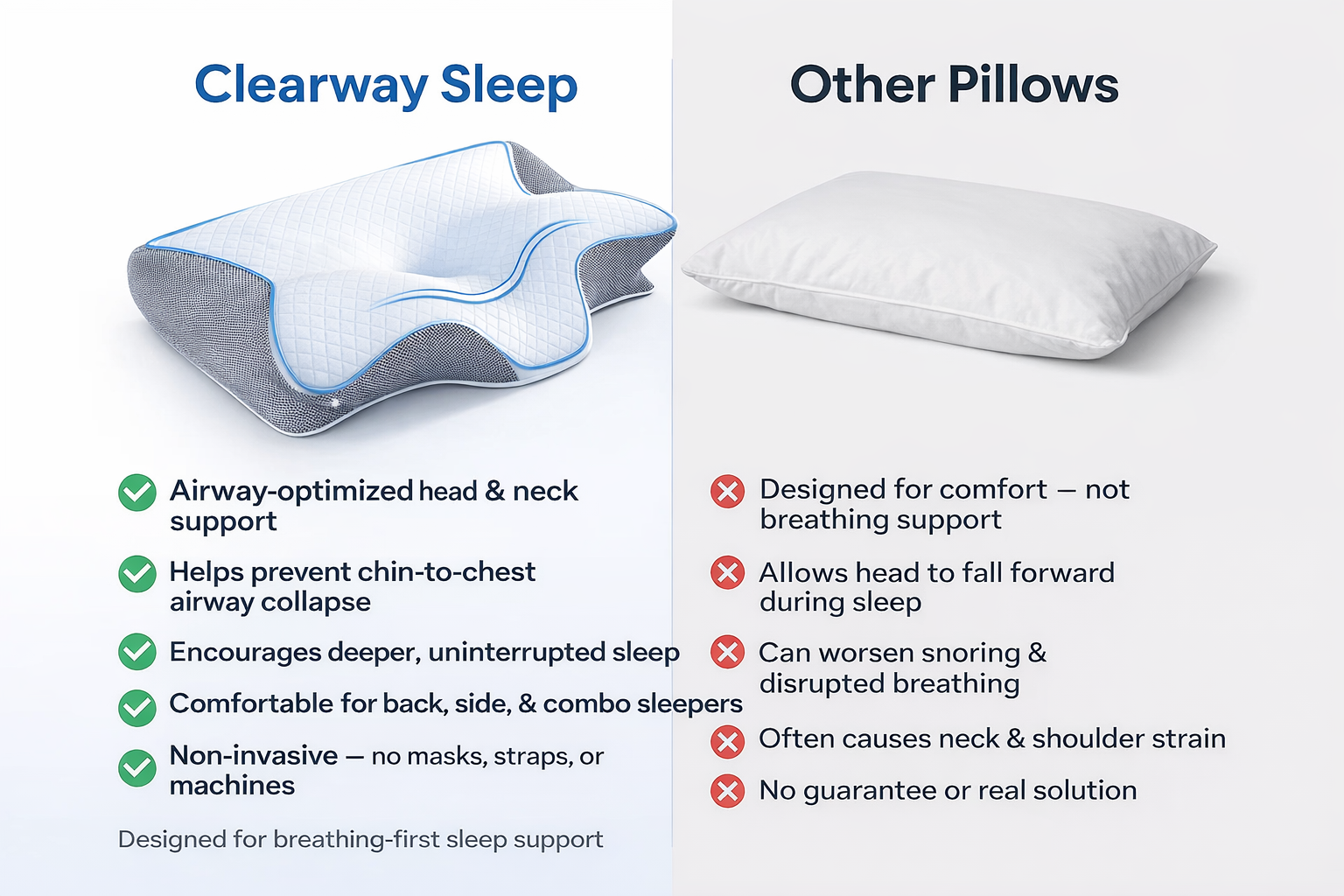The Clearway Sleep Pillow is designed with one goal: keep your airway open naturally by supporting proper cervical alignment.